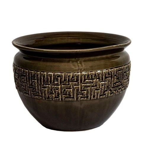 Accentuate the richness of your foliage with the Lena Decorative Planter in Olive. With a deep glazed finish and inlaid with Oriental, embossed panel, this Lena Planter will shine indoors and out.